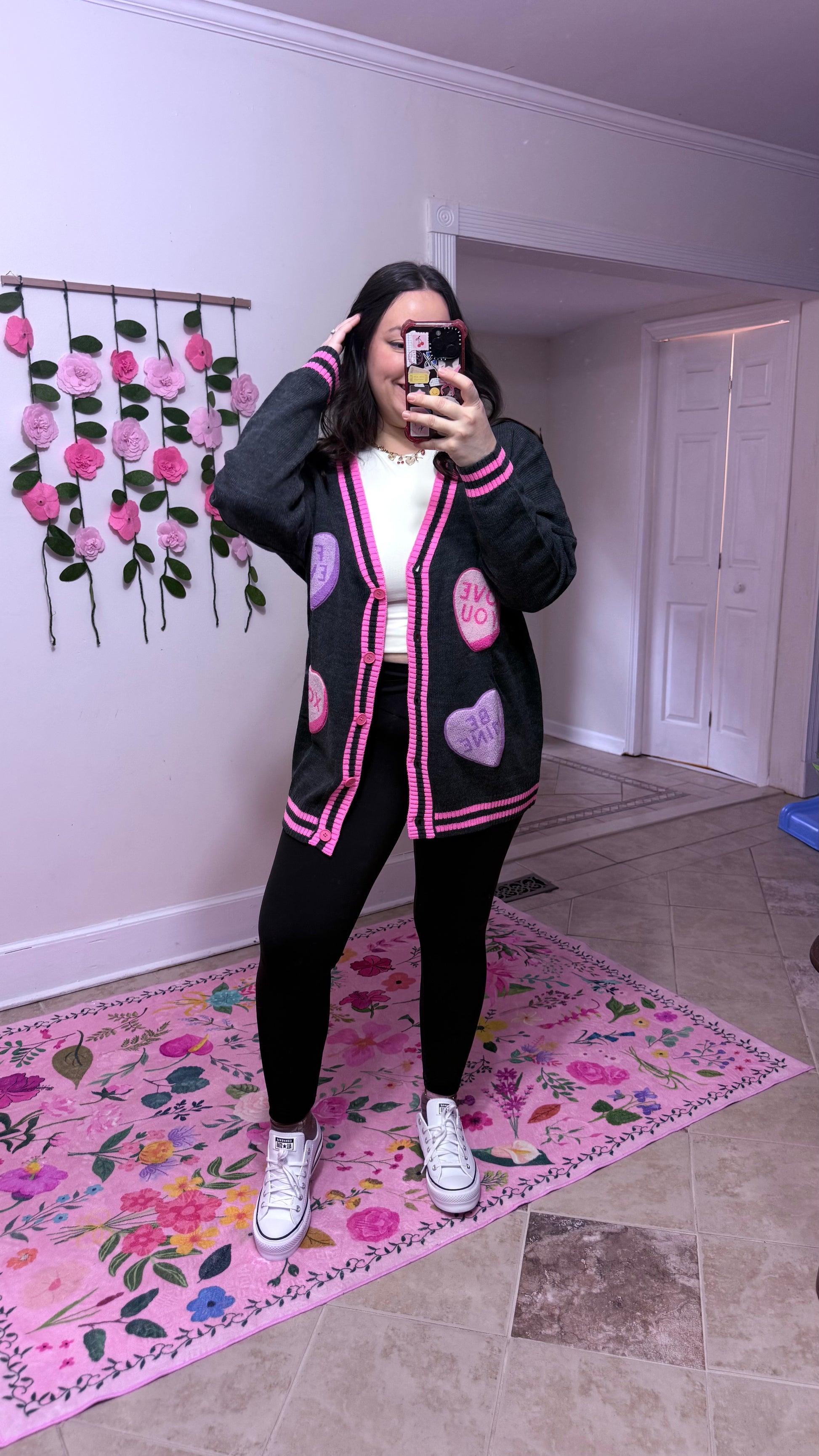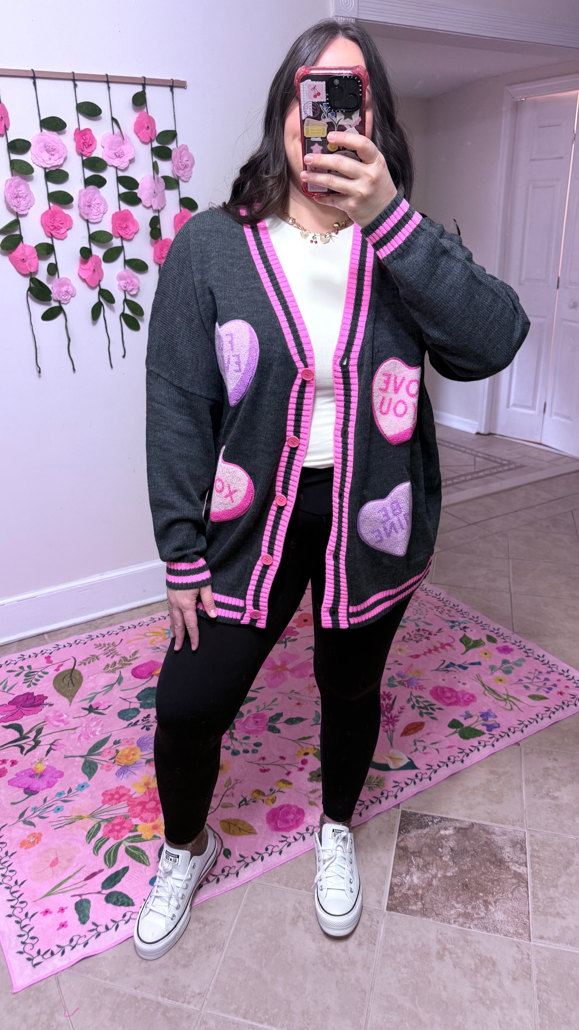 Sweet meets cozy in our Candy Heart Cardi π This chenille patch cardigan features a soft charcoal base with bold pink trim and plush candy-heart patches in pink and lavender that say LOVE YOU and BE MINE.