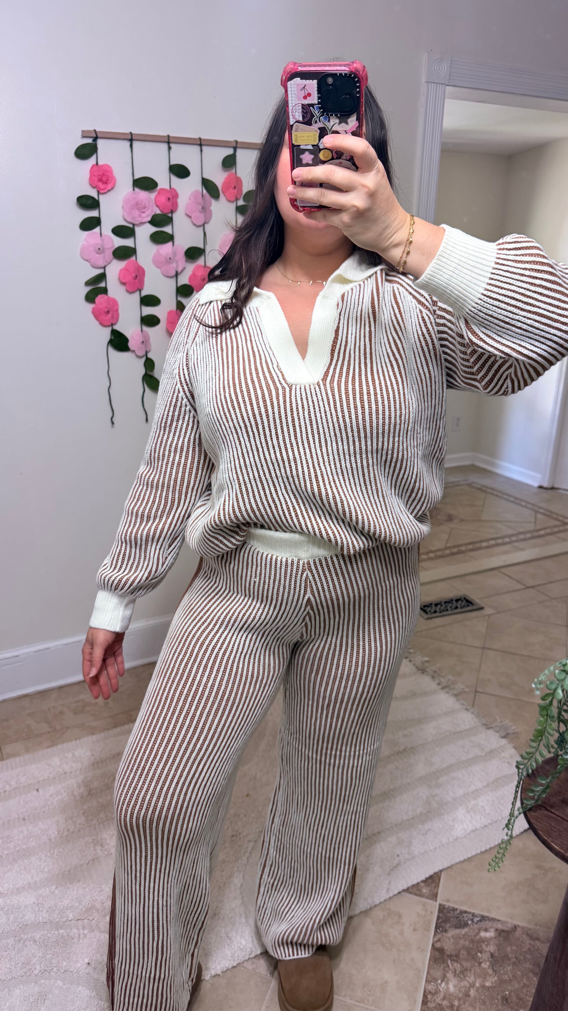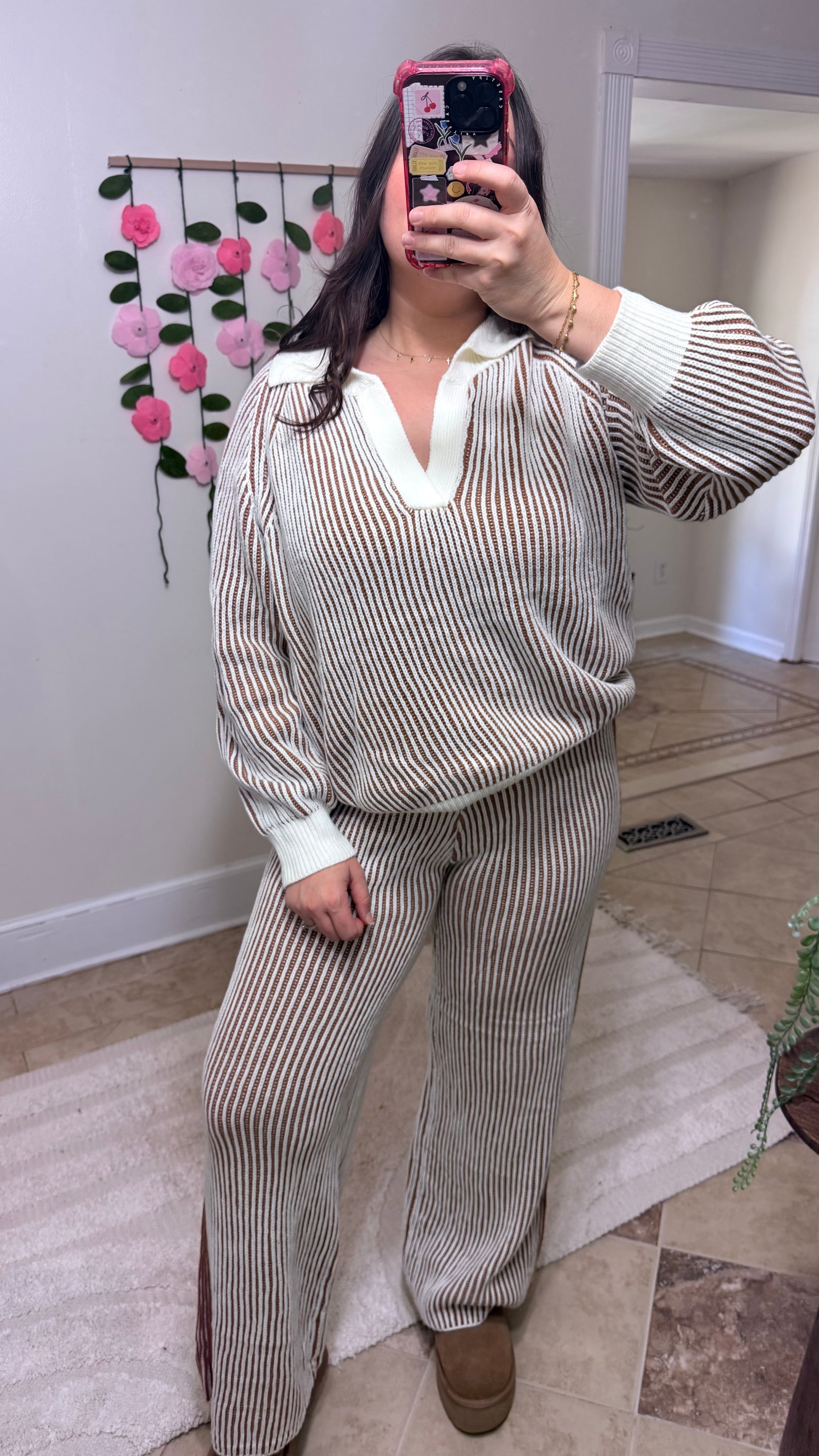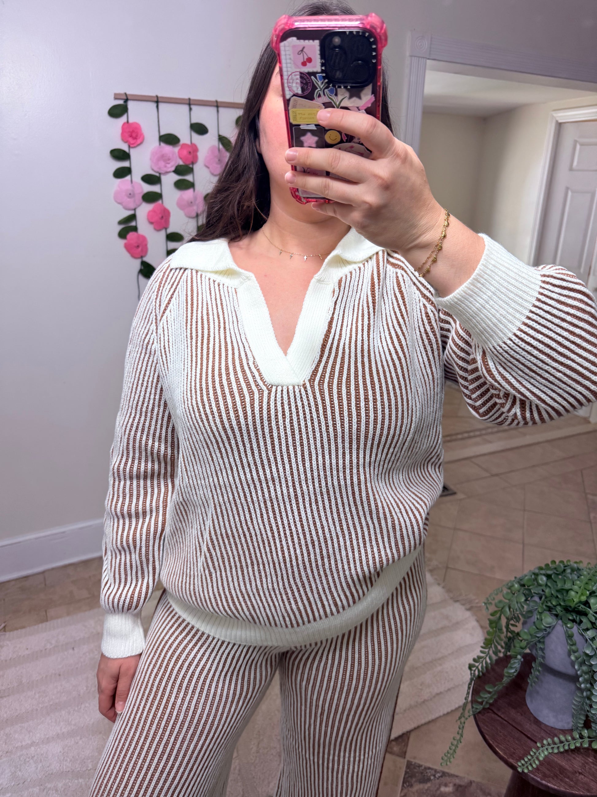 This dreamy two-piece lounge set features a soft ivory and cinnamon ribbed knit texture with a relaxed, elevated vibe. The long-sleeve sweater and wide-leg pants combo is effortlessly chic — perfect for cozy weekends, travel days, or coffee dates where comfort and cuteness are required.