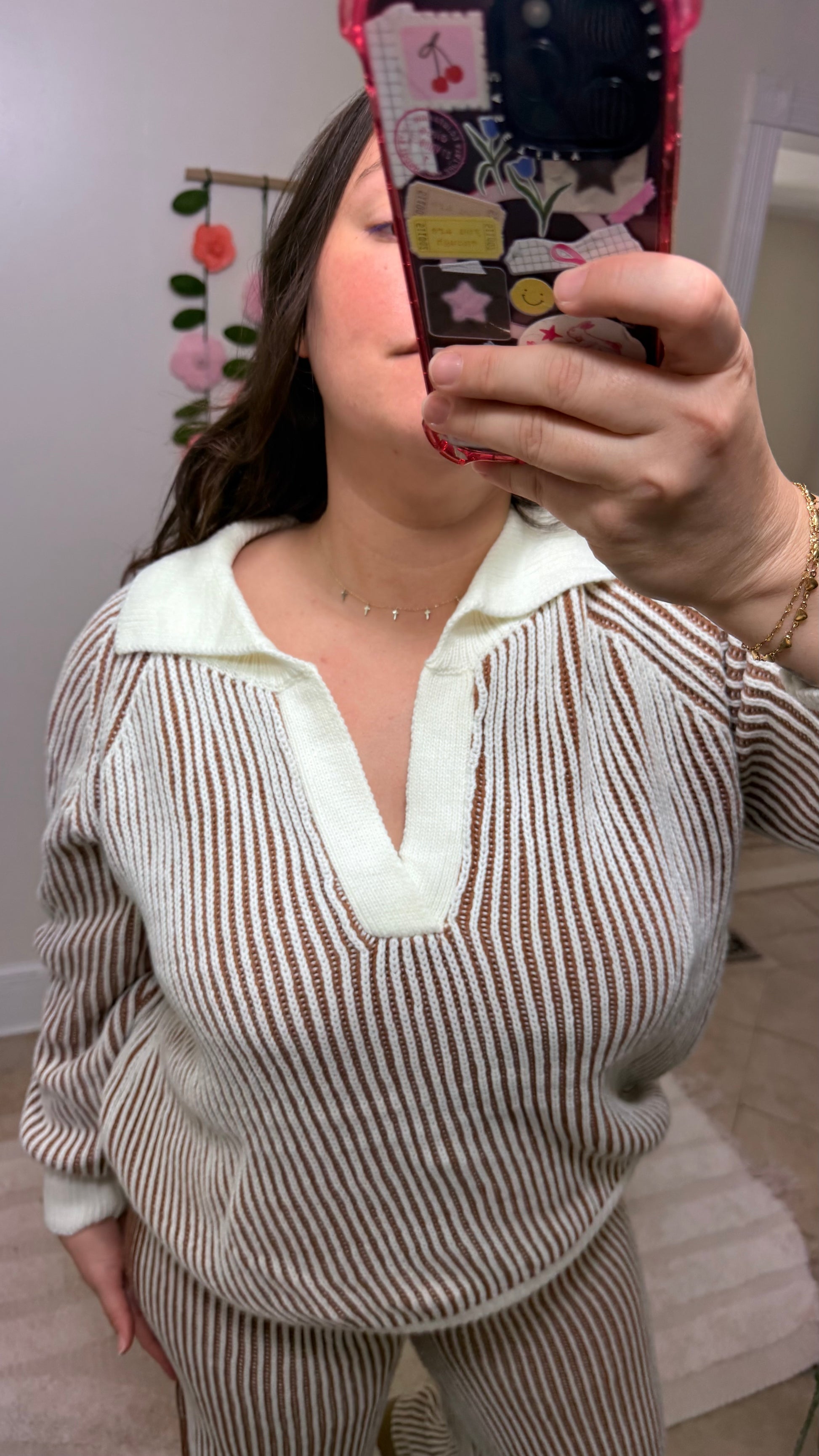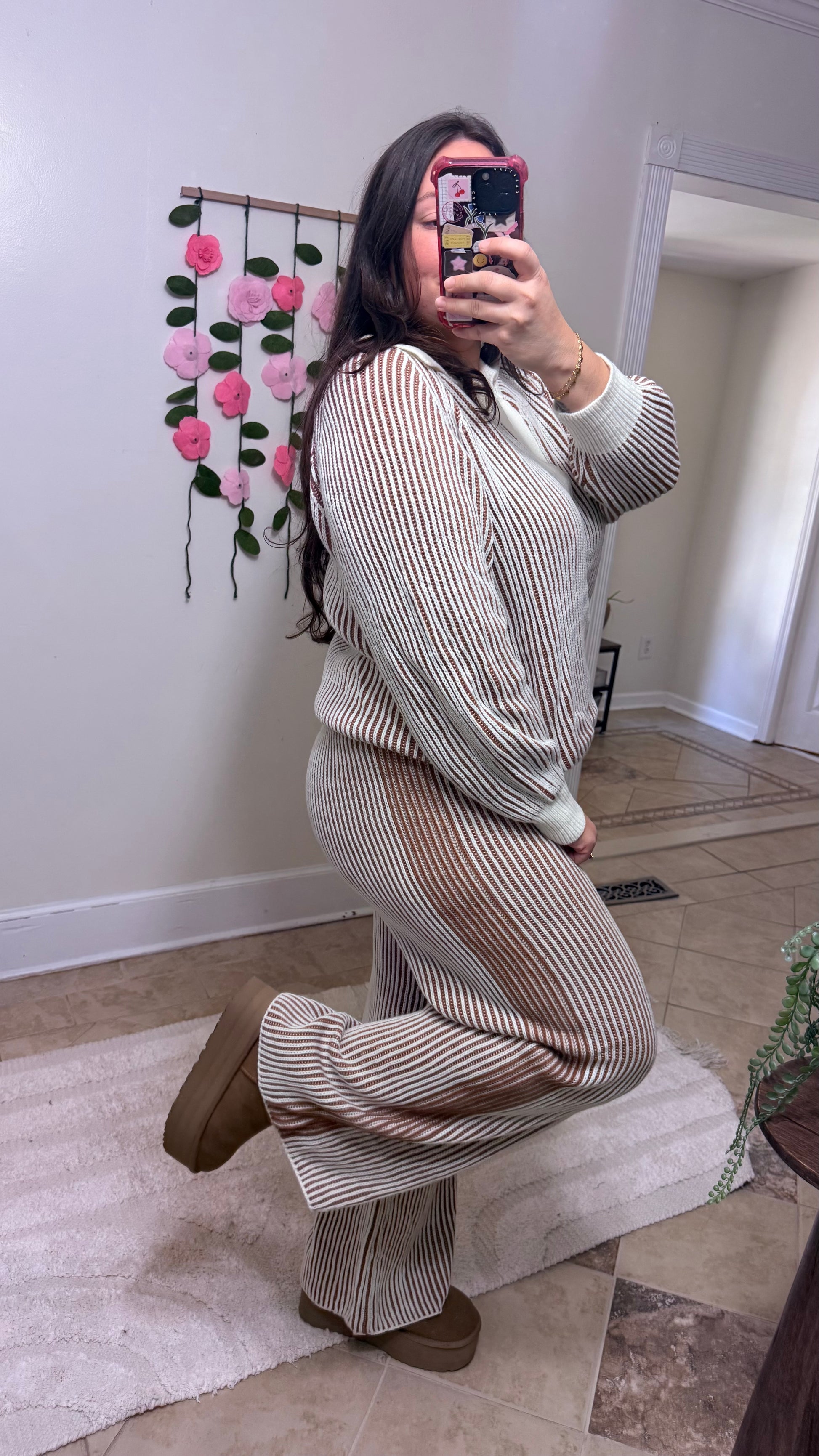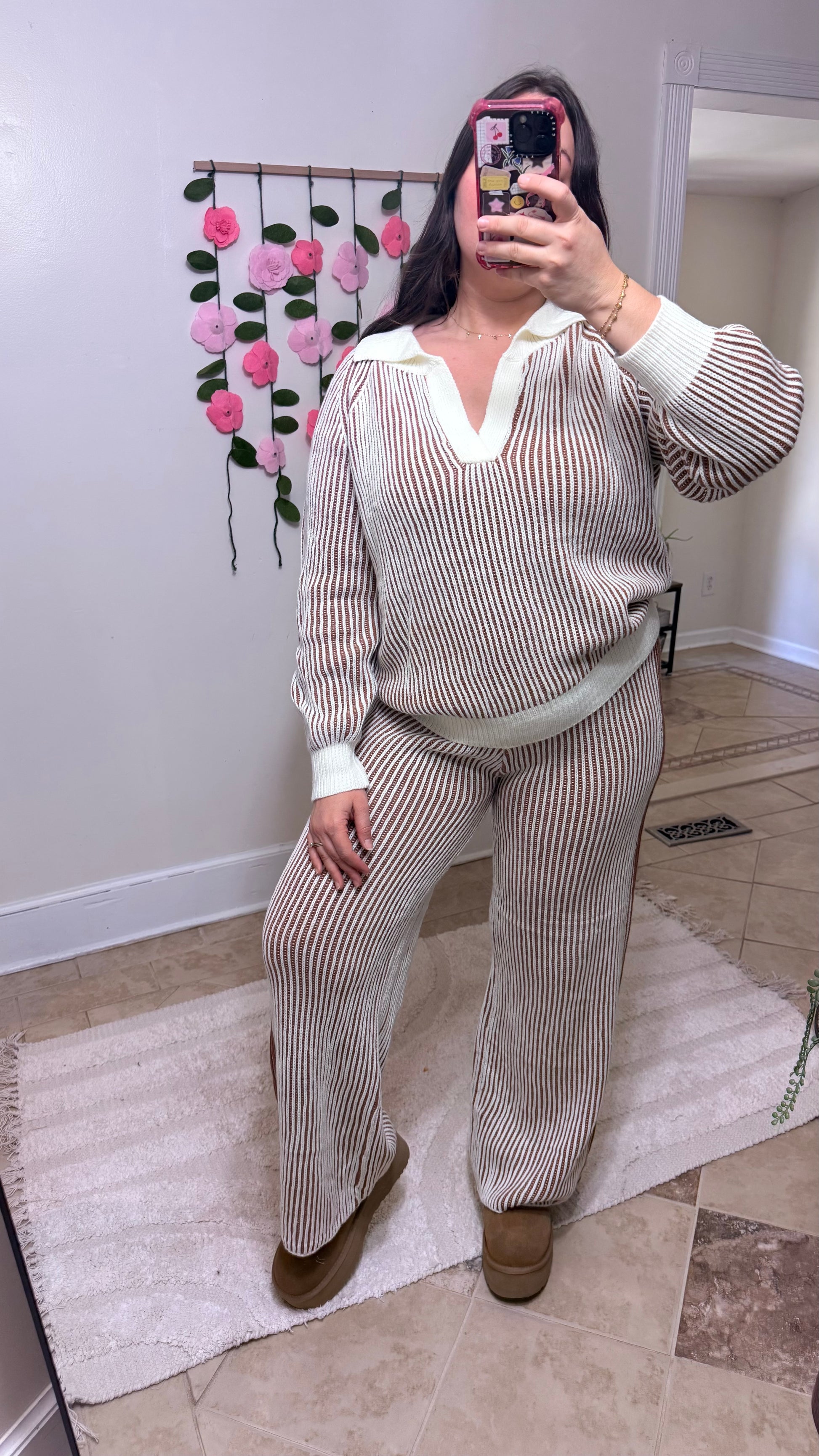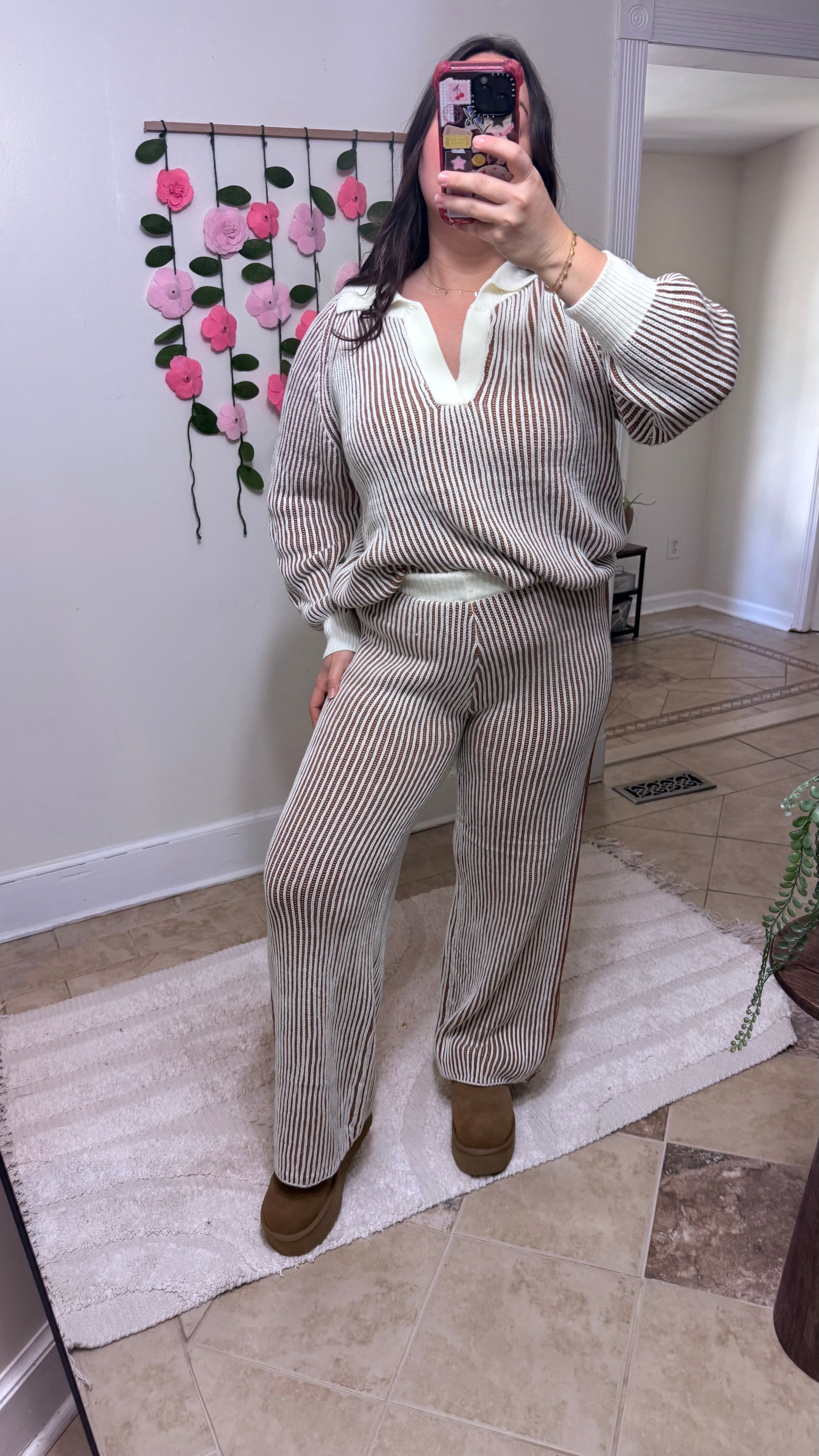This dreamy two-piece lounge set features a soft ivory and cinnamon ribbed knit texture with a relaxed, elevated vibe. The long-sleeve sweater and wide-leg pants combo is effortlessly chic — perfect for cozy weekends, travel days, or coffee dates where comfort and cuteness are required.