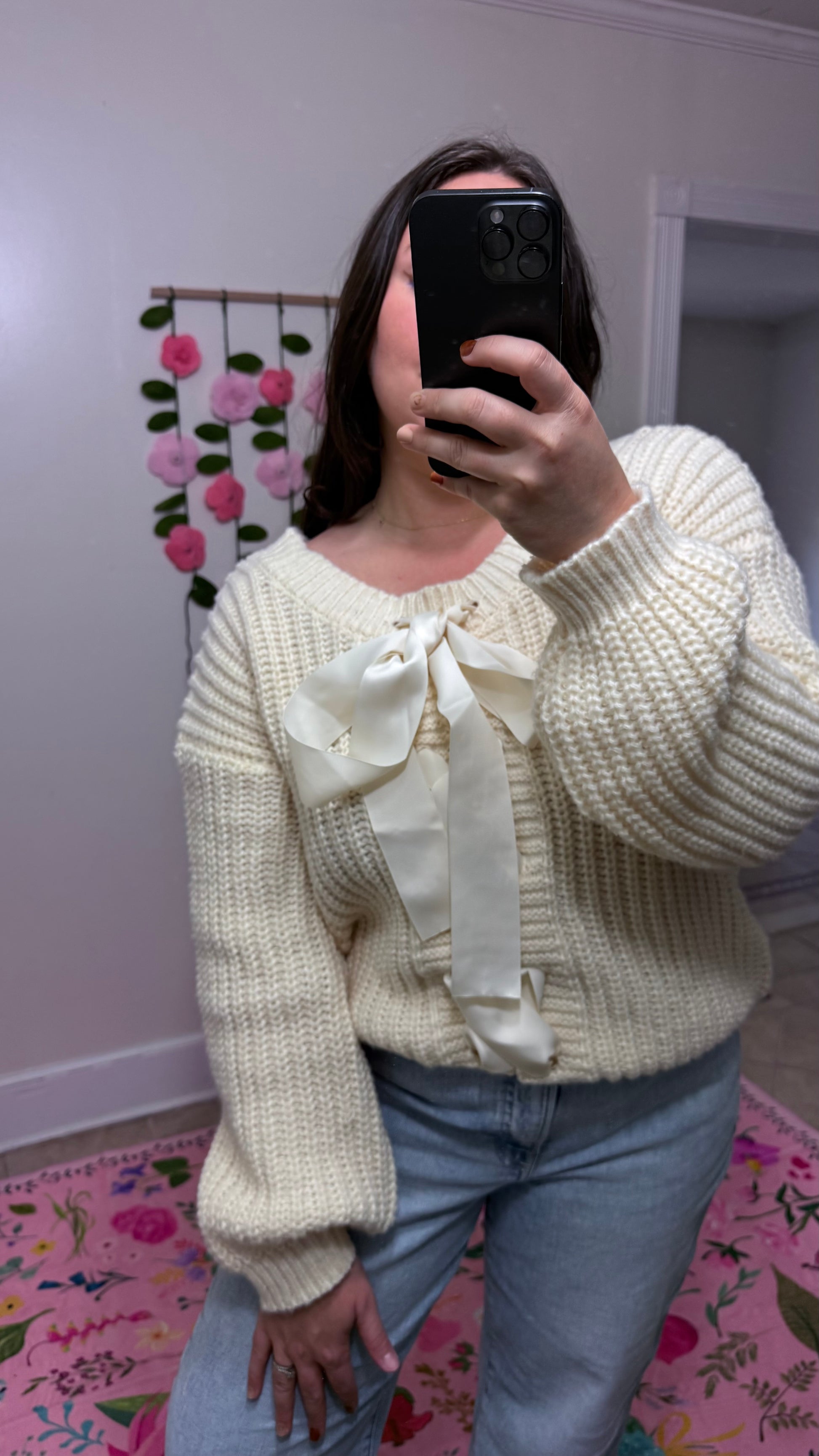 The Sugar Bow Sweater is equal parts cozy and feminine, featuring delicate satin bow ties on a soft cable knit body. With its romantic details and relaxed fit, this dreamy knit makes the perfect statement piece for fall and winter. Designed to be non-itchy and ultra-comfy, itβs a must-have for layering or wearing solo.