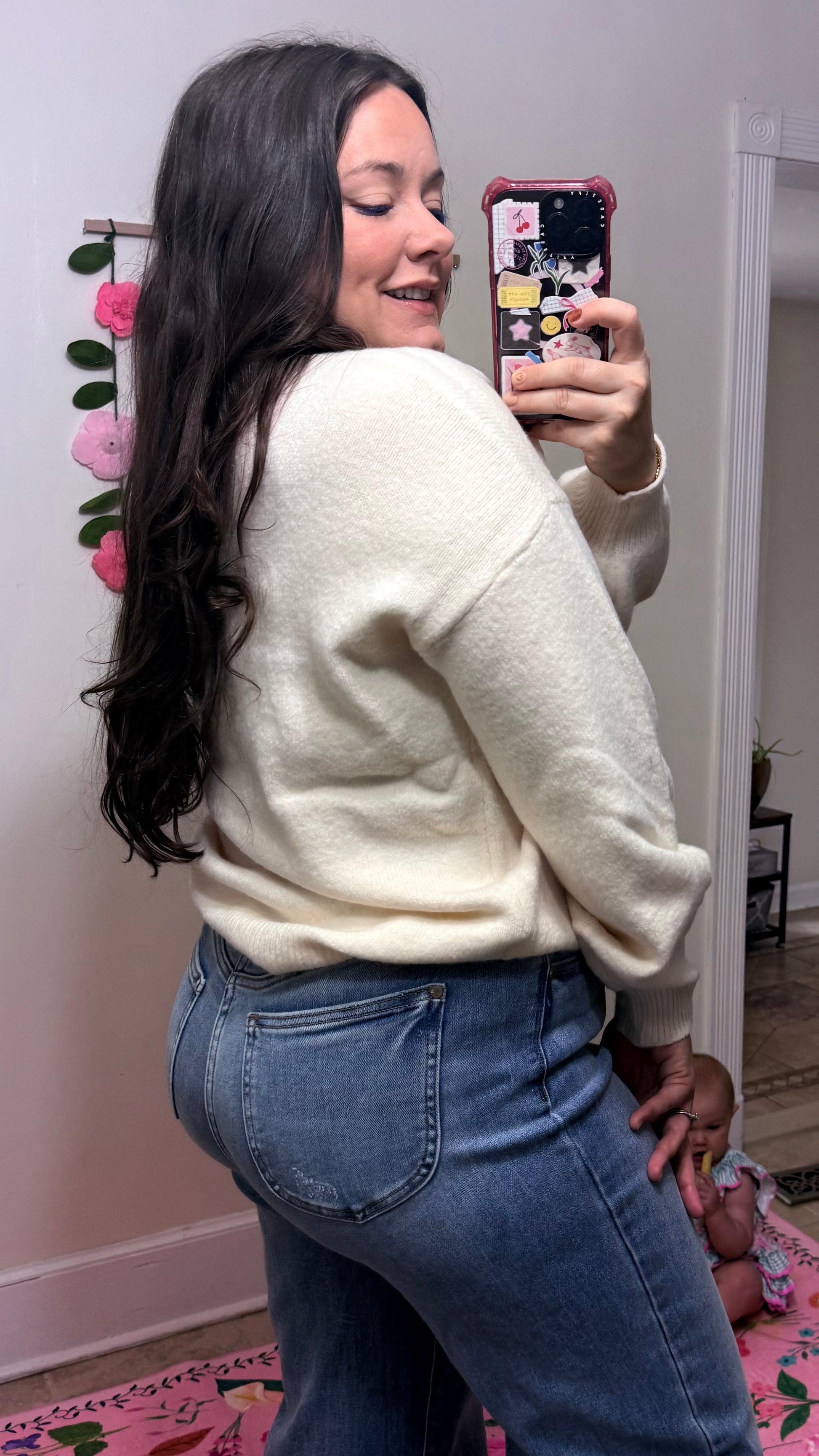 Teddy Love Knit Sweater – Cream Bear Pullover with Blue Ribbon Detail